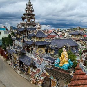 - Chùa Linh Phước – ngôi chùa còn có tên gọi khác là chùa “Ve Chai” bởi trong sân chùa có con rồng dài 49 mét được trang trí bề mặt bằng cả chục ngàn vỏ chai. Đây là công trình kiến trúc khảm sành đặc sắc của thành phố Đà Lạt